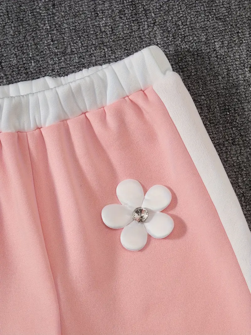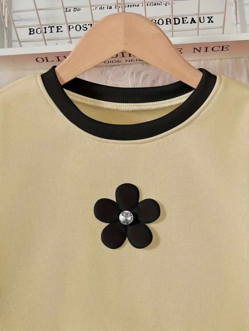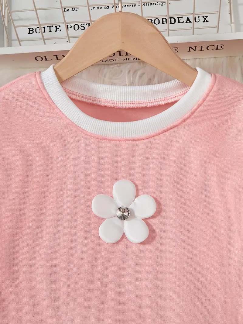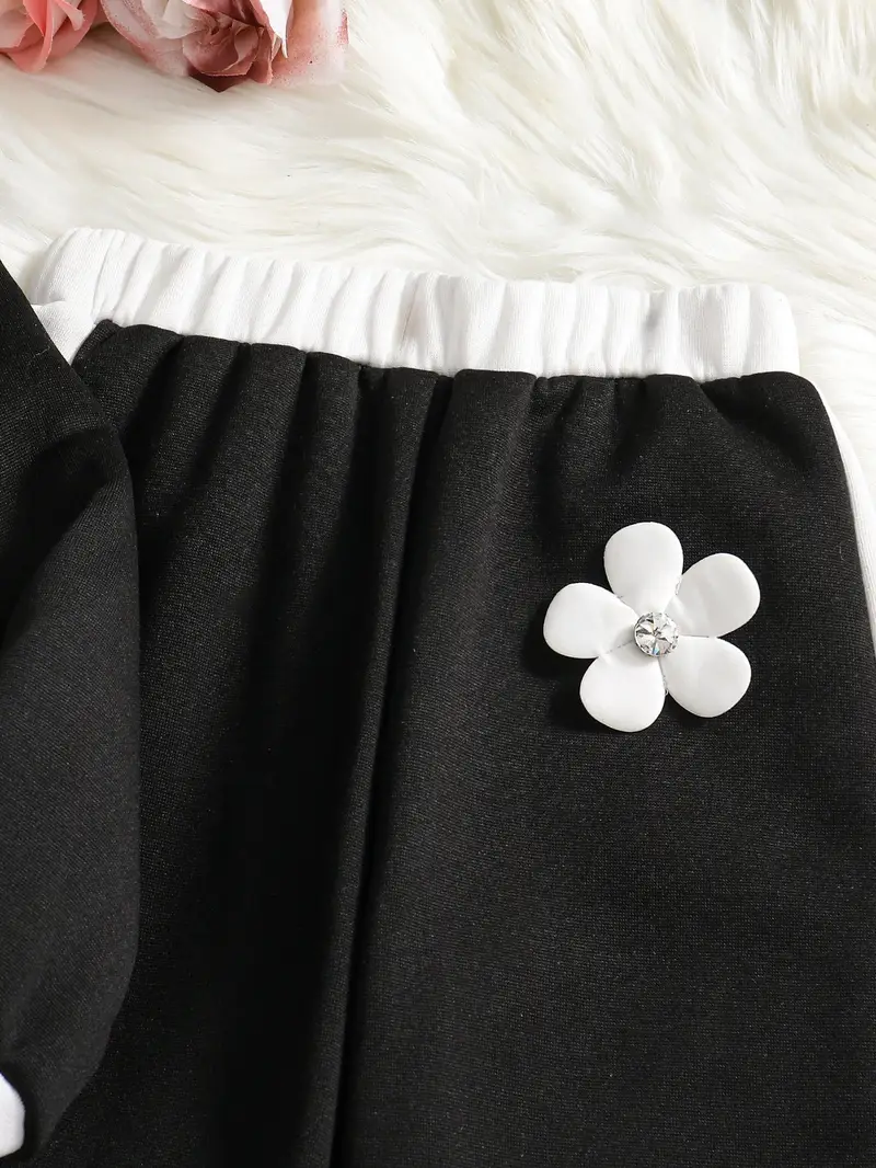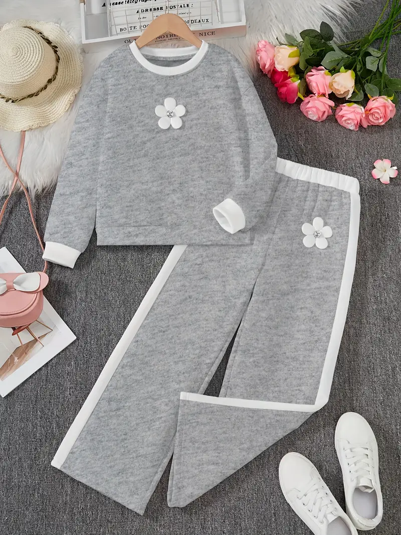 Fashionable long-sleeve crew neck pullover top and matching pants featuring contrast color splicing and 3D handmade floral decor. Perfect for daily outdoor activities, casual wear, and birthday parties.