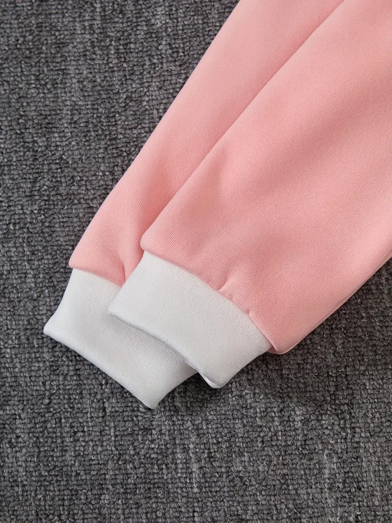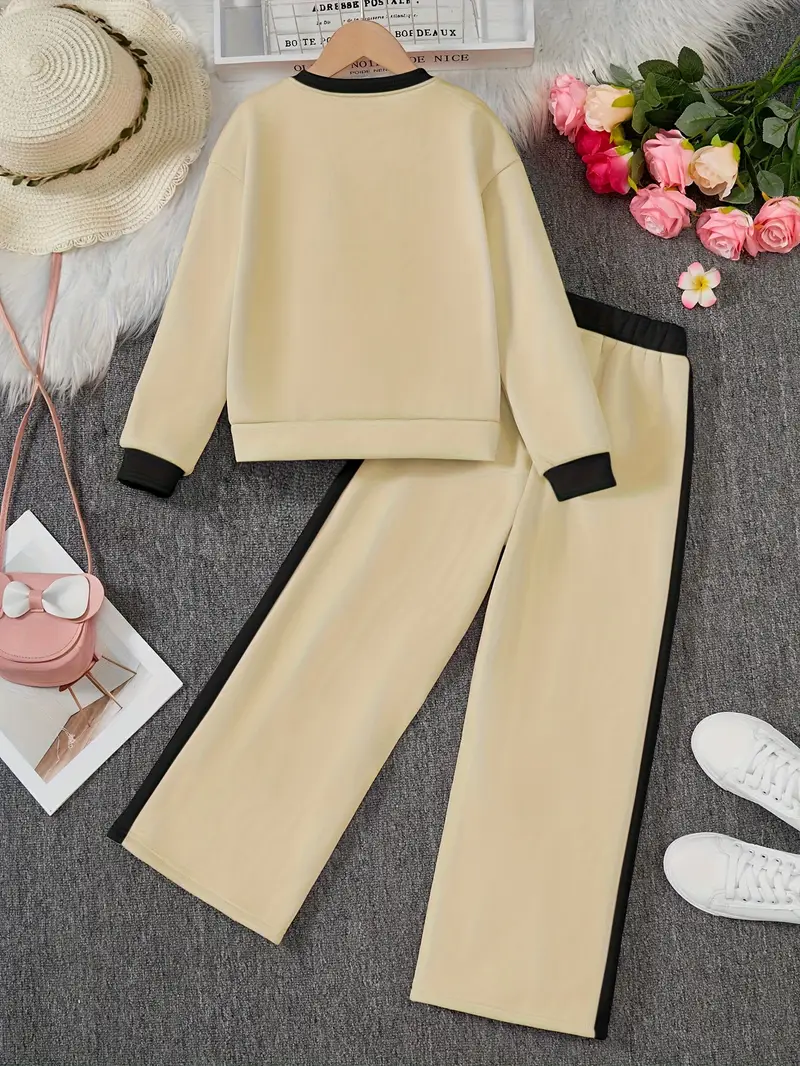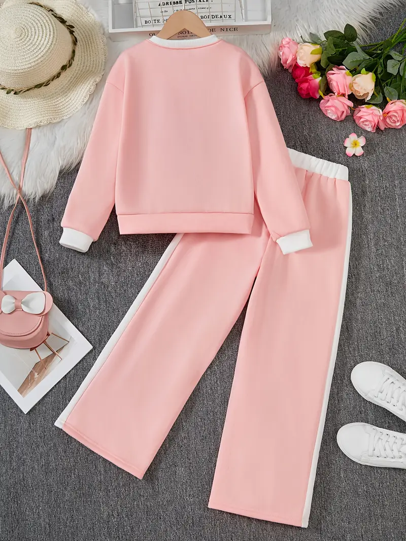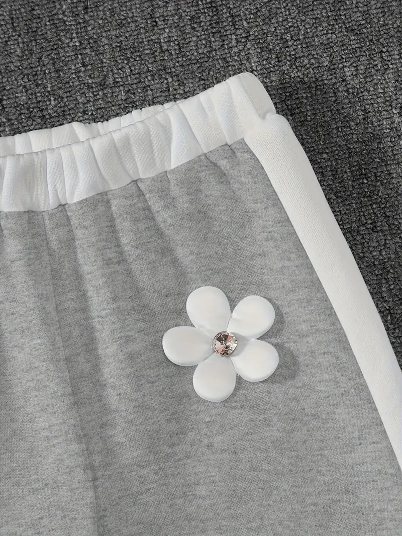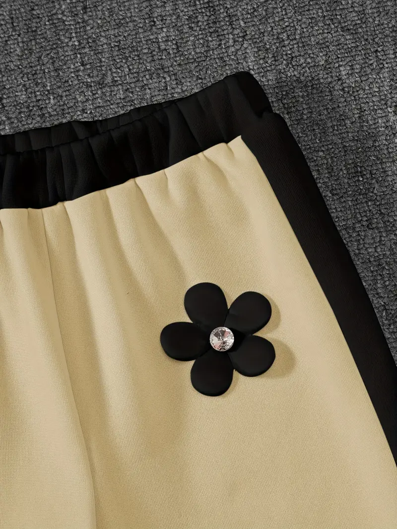 Fashionable long-sleeve crew neck pullover top and matching pants featuring contrast color splicing and 3D handmade floral decor. Perfect for daily outdoor activities, casual wear, and birthday parties.