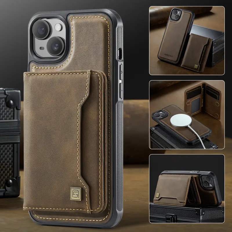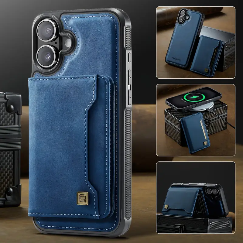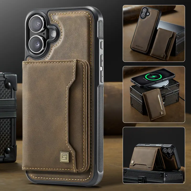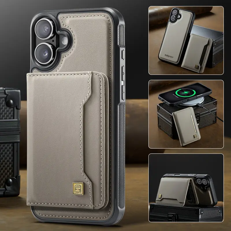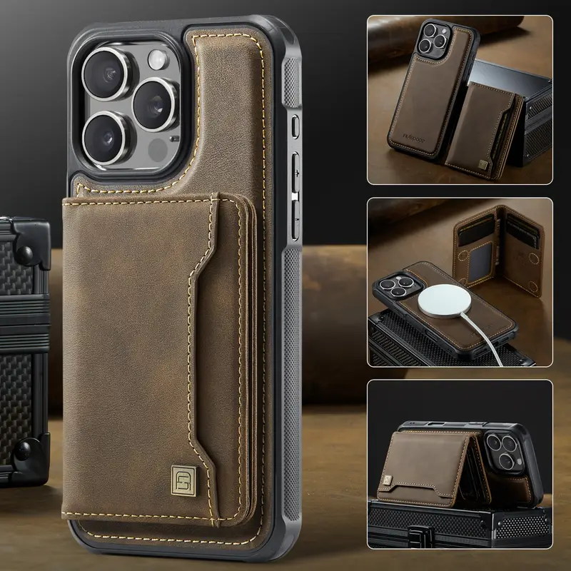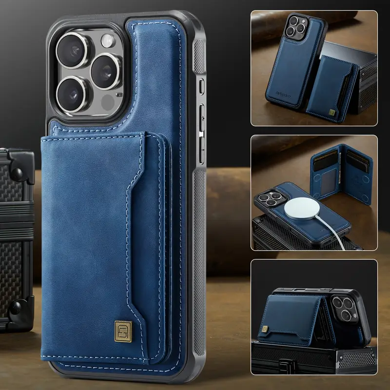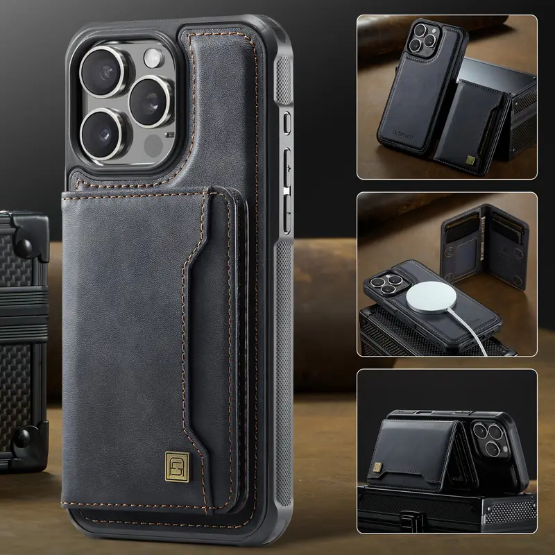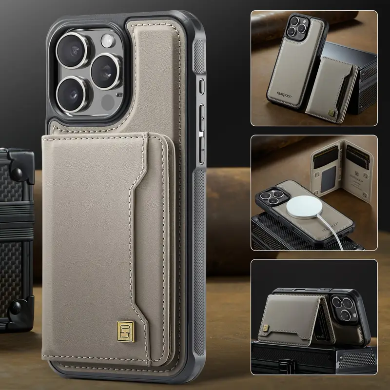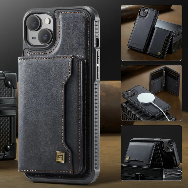 Detachable faux-leather folio with built-in stand, 5 card slots, RFID shielding, and a secure magnetic snap-on inner case. Slim daily carry that protects your phone and replaces your wallet.