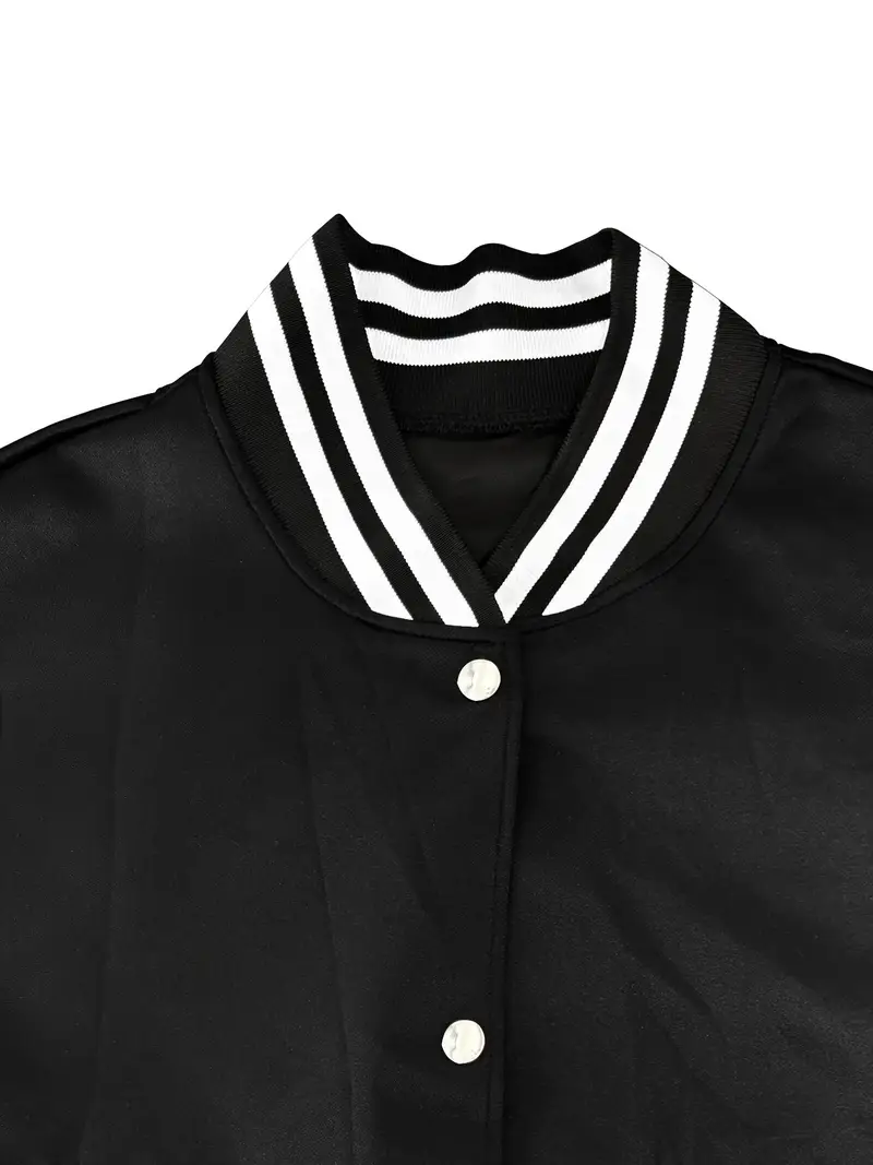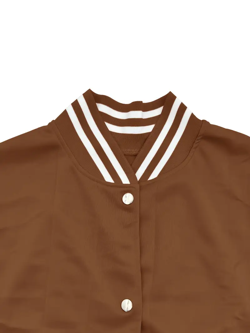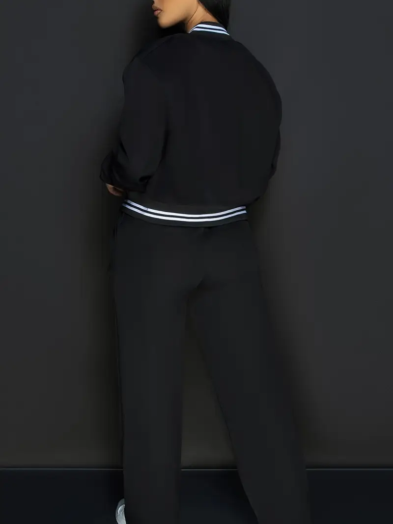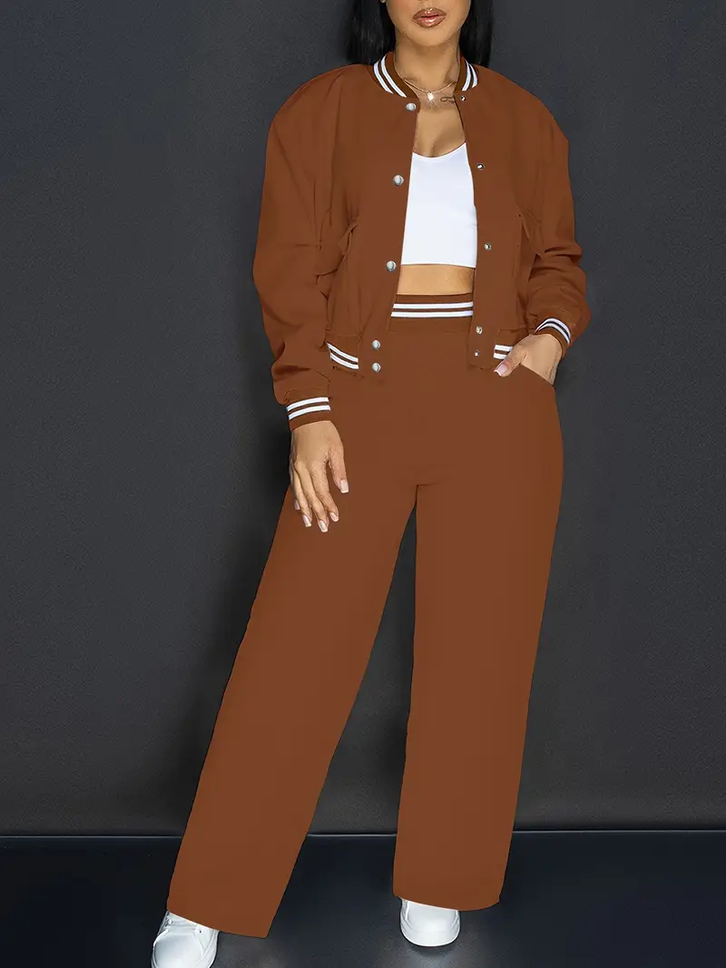 A stylish women’s jumpsuit set featuring a solid color design, baseball collar, and practical pockets. Made from a comfortable polyester blend, perfect for spring and autumn outings or parties.