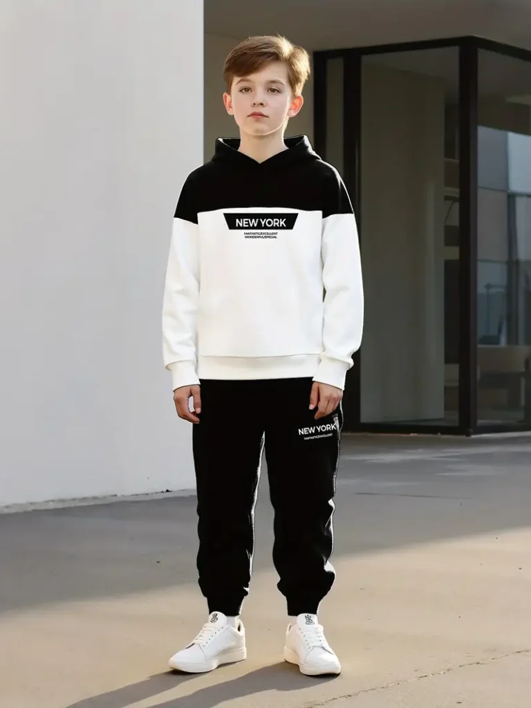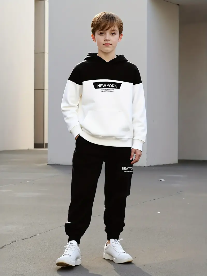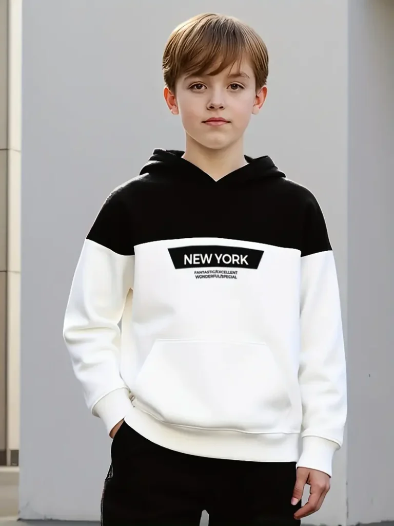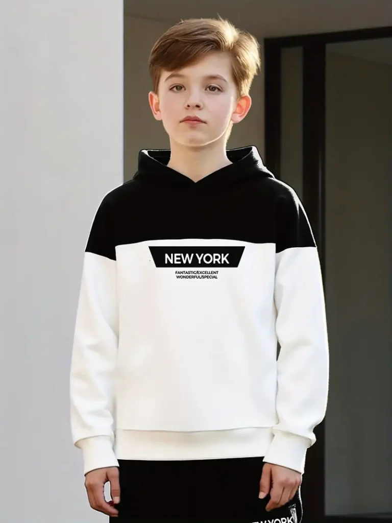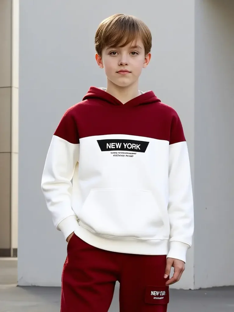 This boys’ long sleeve and pants set is perfect for casual wear in spring and autumn. Featuring a “NEW YORK” letter print contrast color hoodie and drawstring pants, it offers comfort and style with its soft French Terry fabric.