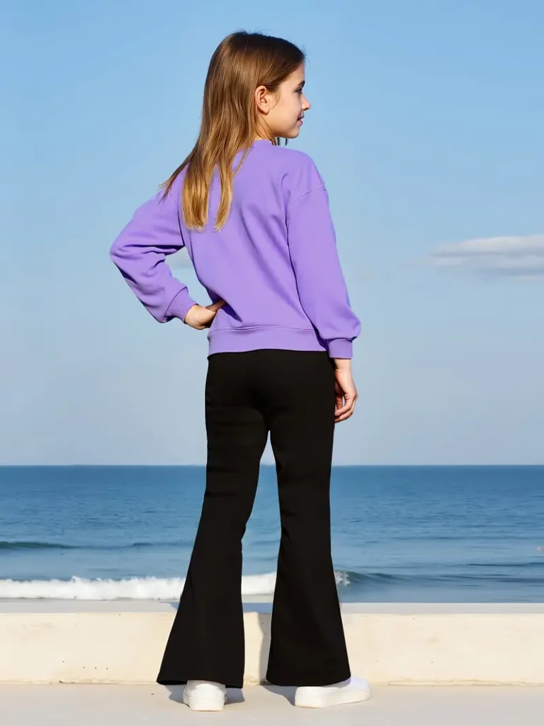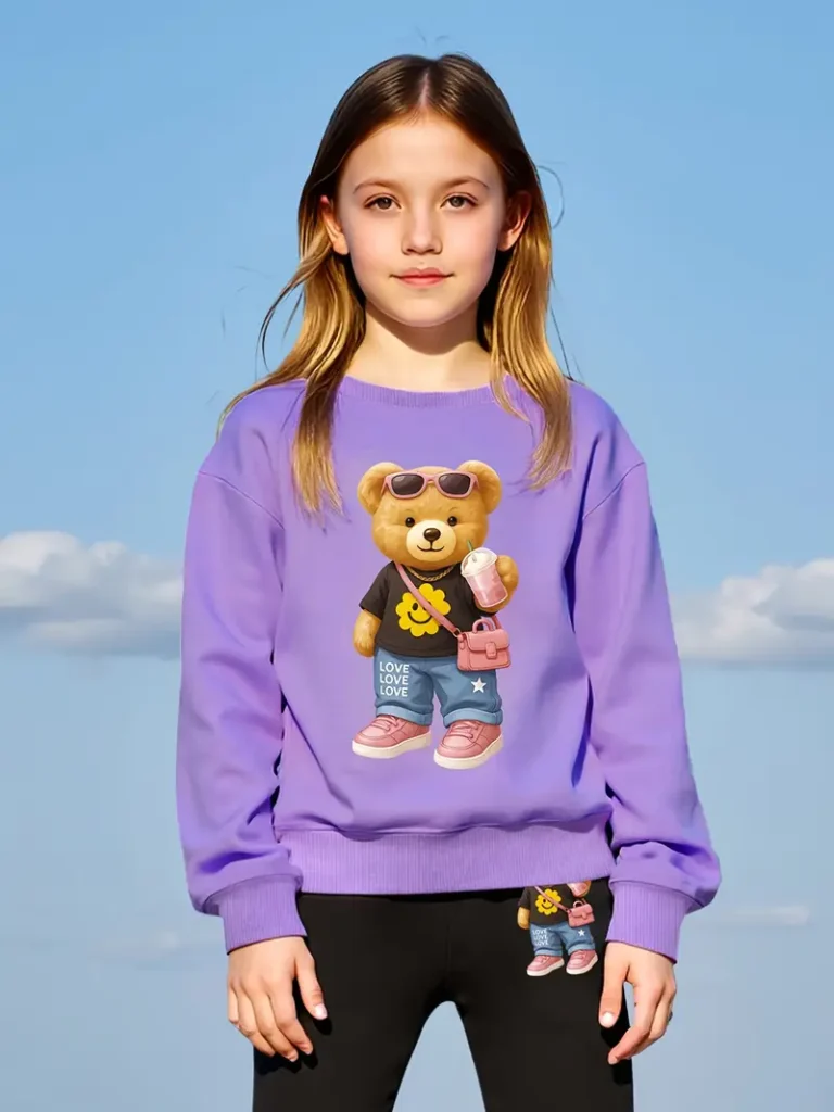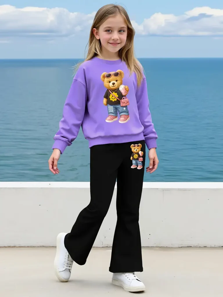Let her express her adorable style with this Girls’ Spring/Autumn Sweatshirt and Flared Pants Set, designed for comfort and charm. The round-neck long-sleeve sweatshirt showcases a cute milk tea bear print, perfectly paired with flared pants for a trendy yet cozy look that’s ideal for daily wear.