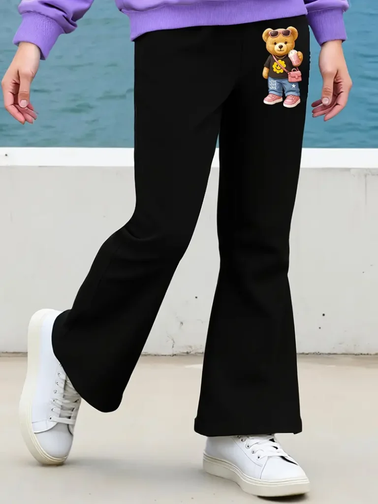 Add sweetness to her everyday look with this Girls’ Milk Tea Bear Print Sweatshirt and Flared Pants Set. Featuring a cute cartoon design and comfy stretch fabric, it’s perfect for school, playdates, and outdoor fun.